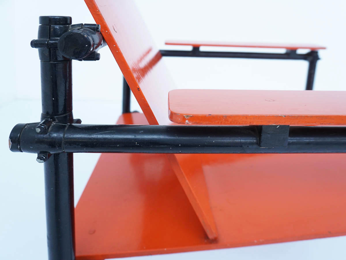 Compensato dipinto di rosso vermiglio, tubo di legno dipinto di nero, metallo