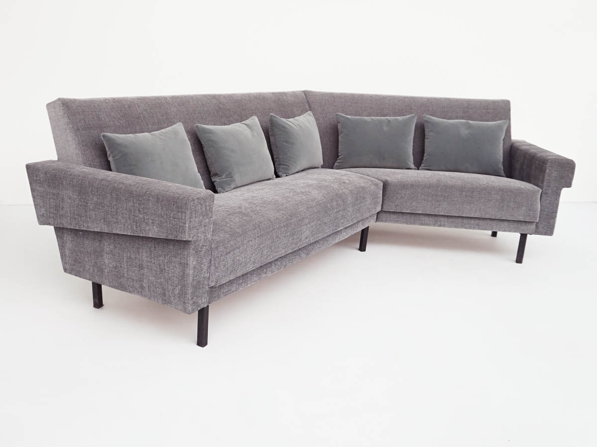 | Material | 5 Feather and Velvet Cushions, Totally new upholstery and cover in lead-gray fabric painted metal |