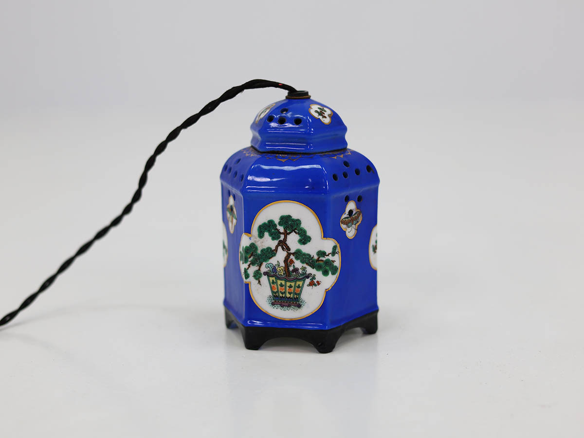 Crafted in high-quality glazed porcelain, this piece was not merely an elegant decorative object, but an authentic perfume burner lamp designed to diffuse fragrance throughout domestic interiors. Combining exotic aesthetics with practical innovation, the lamp reflects the European fascination with Oriental-inspired design during the early 20th century. The striking blue chinoiserie decoration enhances the architectural pagoda form, creating a sculptural and visually captivating statement piece.