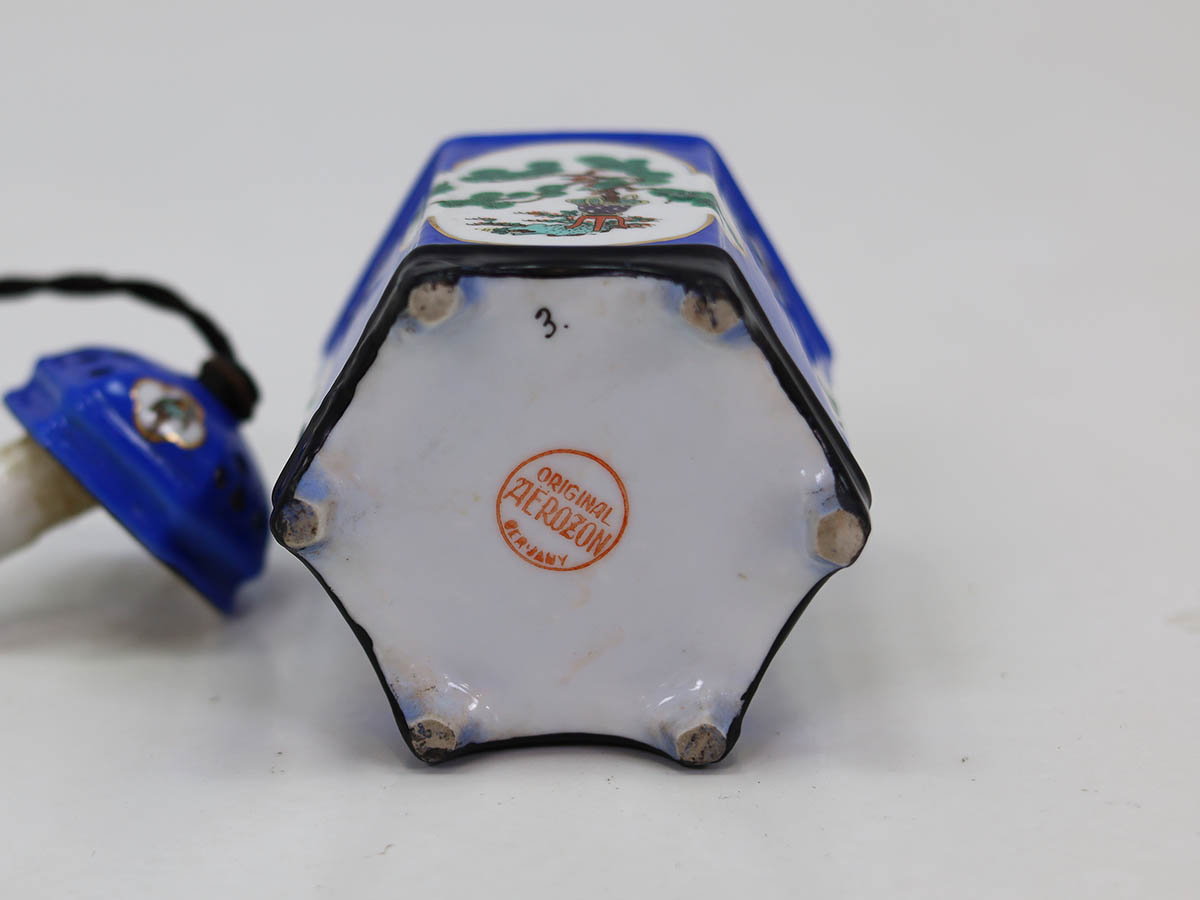 The Aerozon porcelain lamp produced in Germany during the 1920s–1930s, designed in the shape of a pagoda-inspired structure and decorated with a vibrant blue chinoiserie motif, is a remarkable example of functional decorative design from the interwar period.