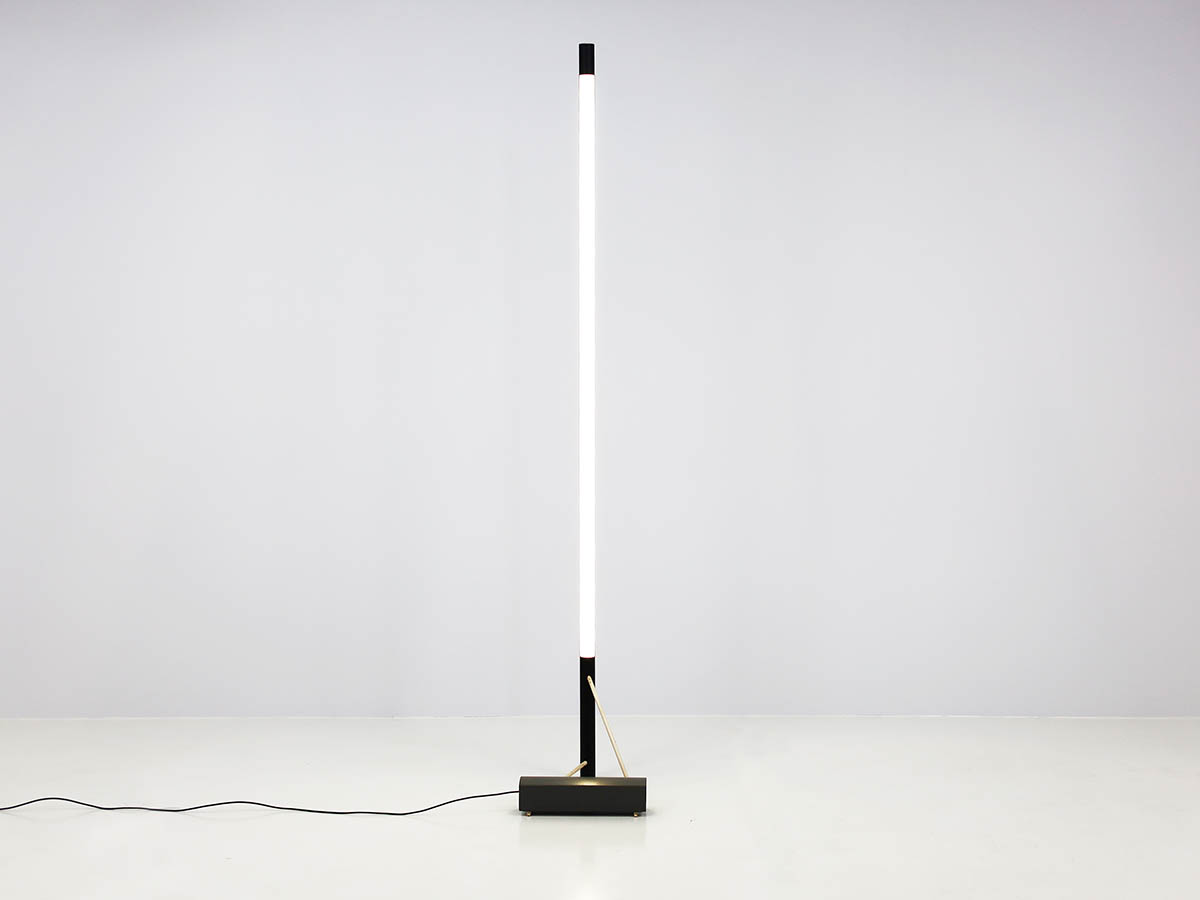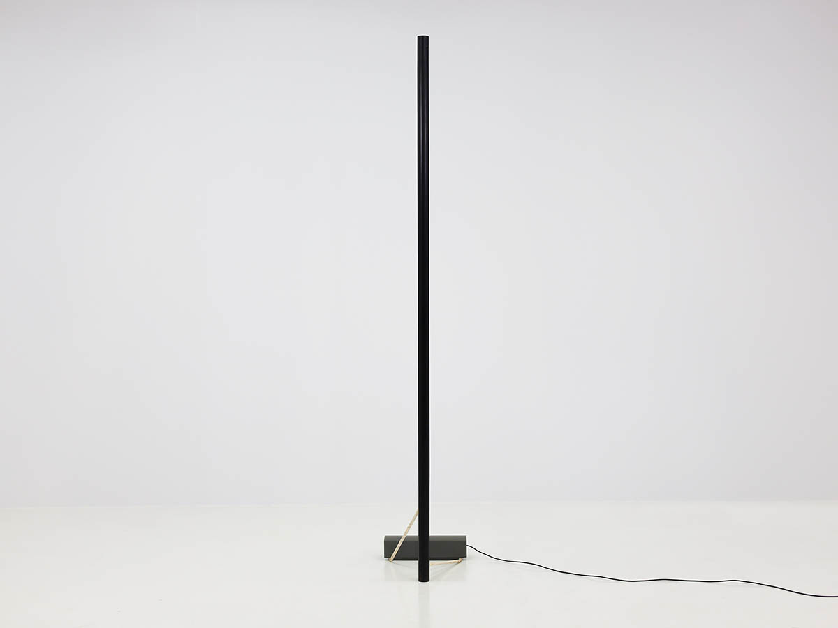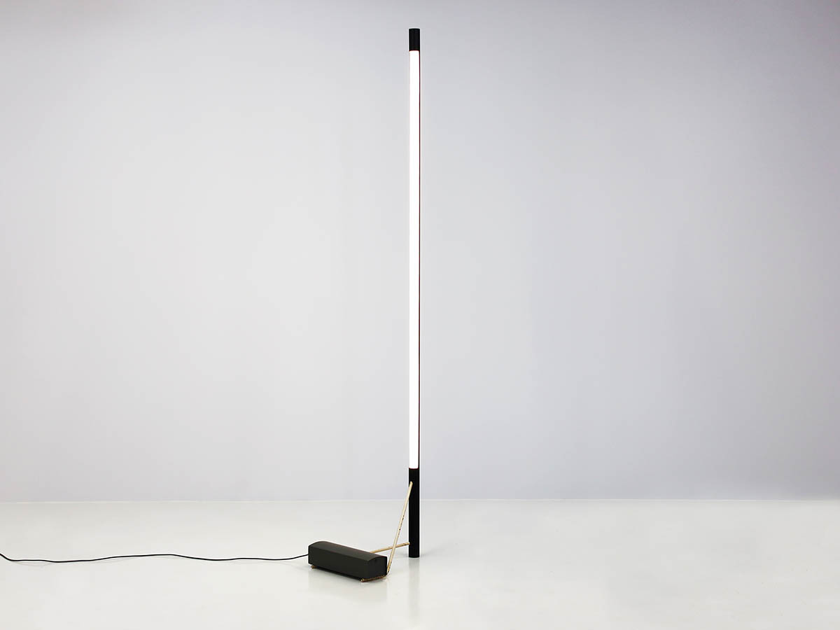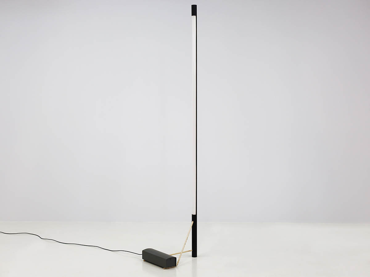 Gino Sarfatti’s ‘1063’ floor lamp is widely regarded as one of the most iconic pieces in the Italian designer’s body of work. The lamp stands tall, towering above eye level, and is made up of a lacquered aluminum tube and a fluorescent bulb. It is positioned vertically on the floor, kept in balance by a ballast that holds the neon transformer.
