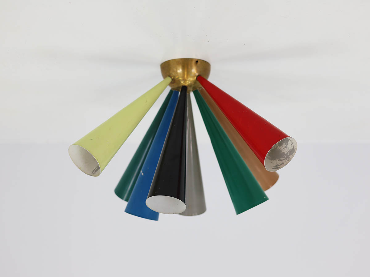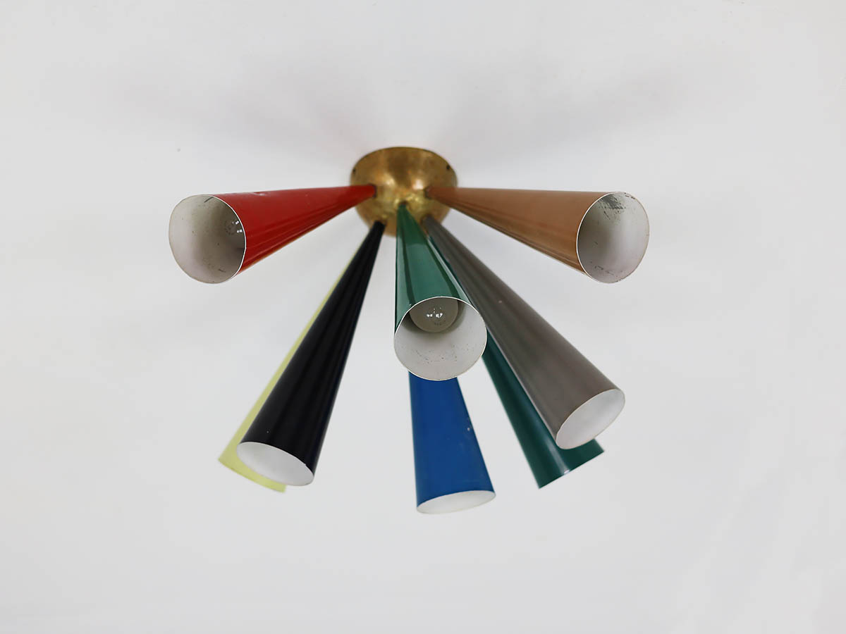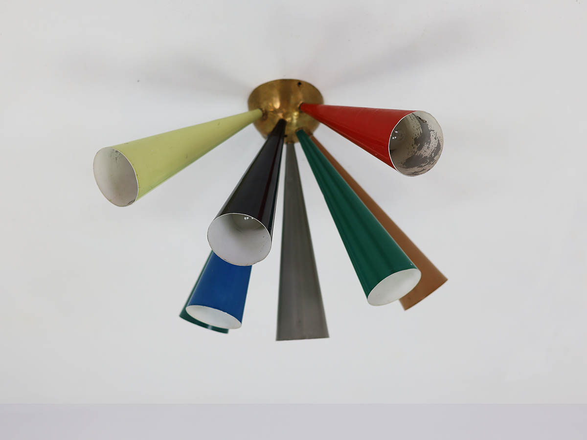 “Diabolo” Lamps – Iconic and Rare Pieces: Among Moor’s most sought-after designs are the Diabolo lamps, featuring conical shades and metal-and-brass bases, with striking color contrasts and adjustable mechanisms. Especially rare is the half-Diabolo version with 7 colored conical tubes, a unique collector’s piece that represents the pinnacle of Moor’s aesthetic and technical innovation for BAG Turgi. These lamps exemplify functional design, chromatic elegance, and top-quality craftsmanship, making them highly prized in the vintage lighting market.