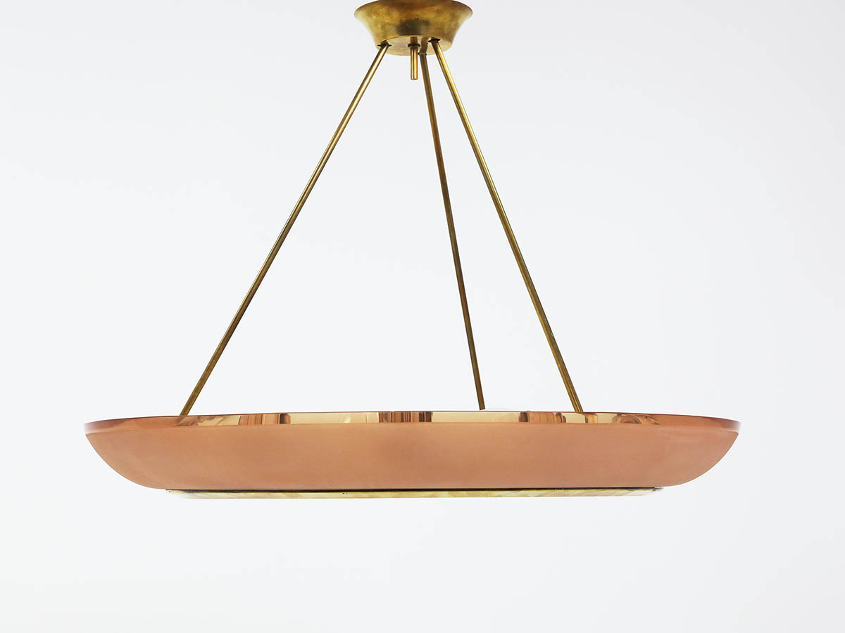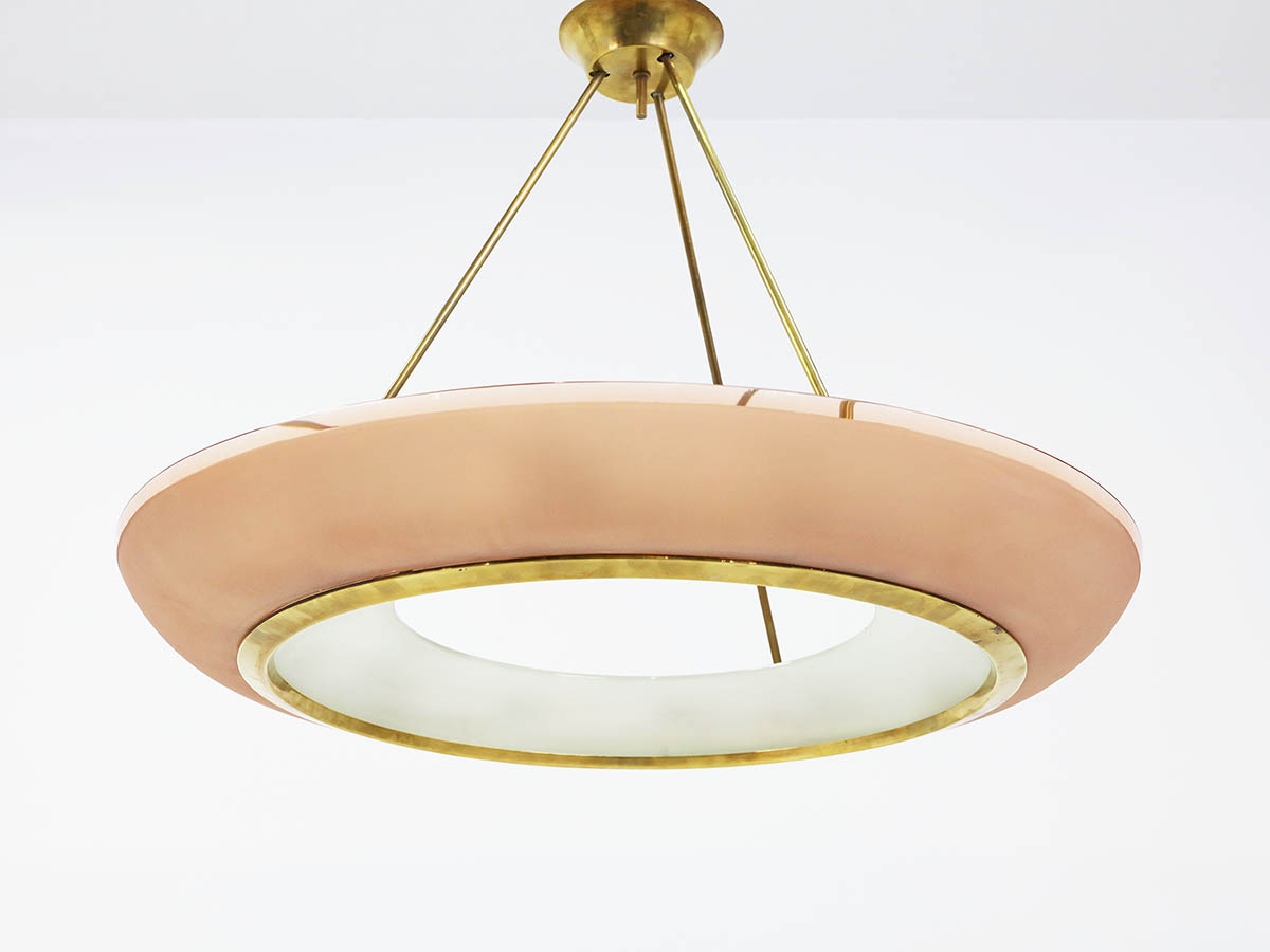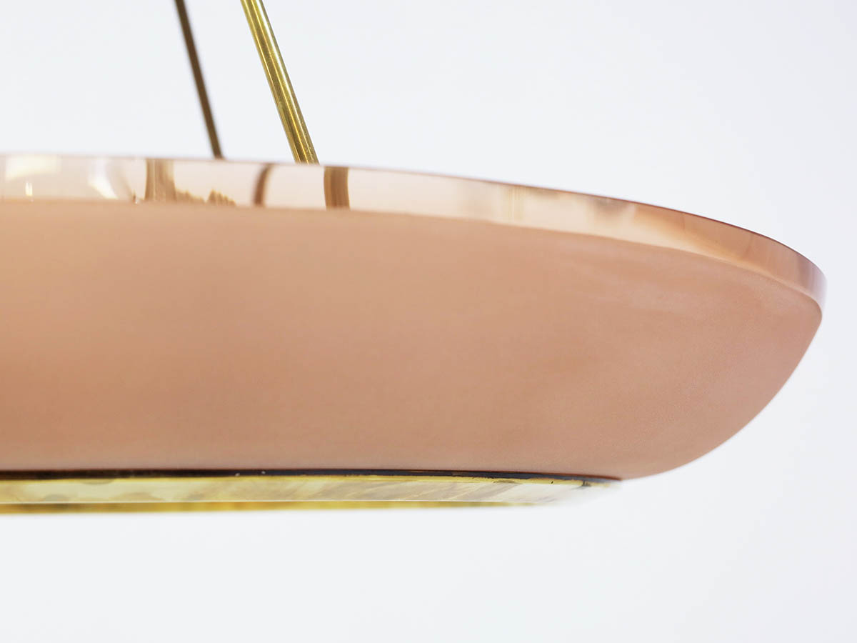 Among his most notable creations is the large chandelier model 1881, an outstanding example of Max Ingrand’s design vision. Crafted in curved pink glass, this chandelier combines visual lightness with a strong sculptural presence, diffusing a warm and sophisticated glow. This model is extremely rare, and in this significant 90 cm size it represents a unique piece, making it highly valuable for collectors and high-end interior design projects. The refined glass craftsmanship—hallmark of Fontana Arte—enhances the material and chromatic qualities of the design, making it ideal for prestigious residential and contract environments.