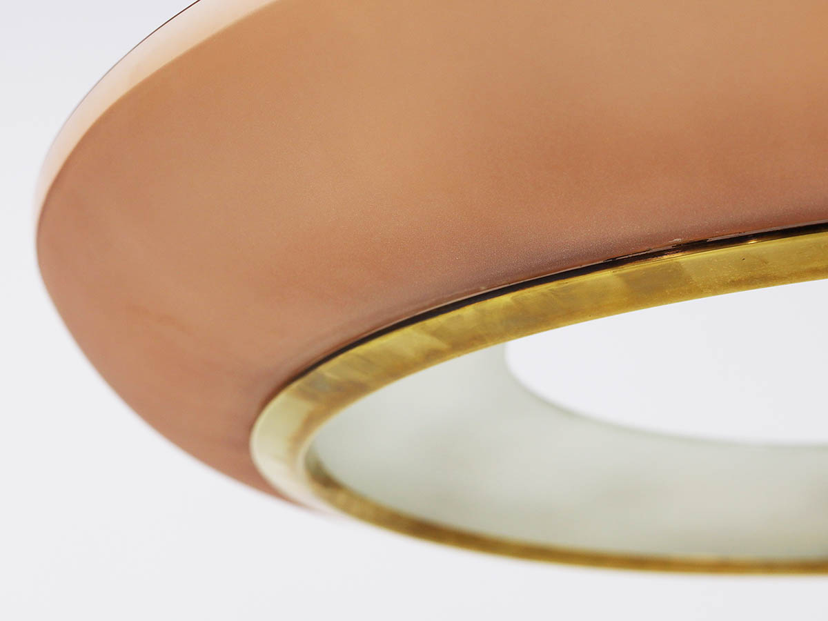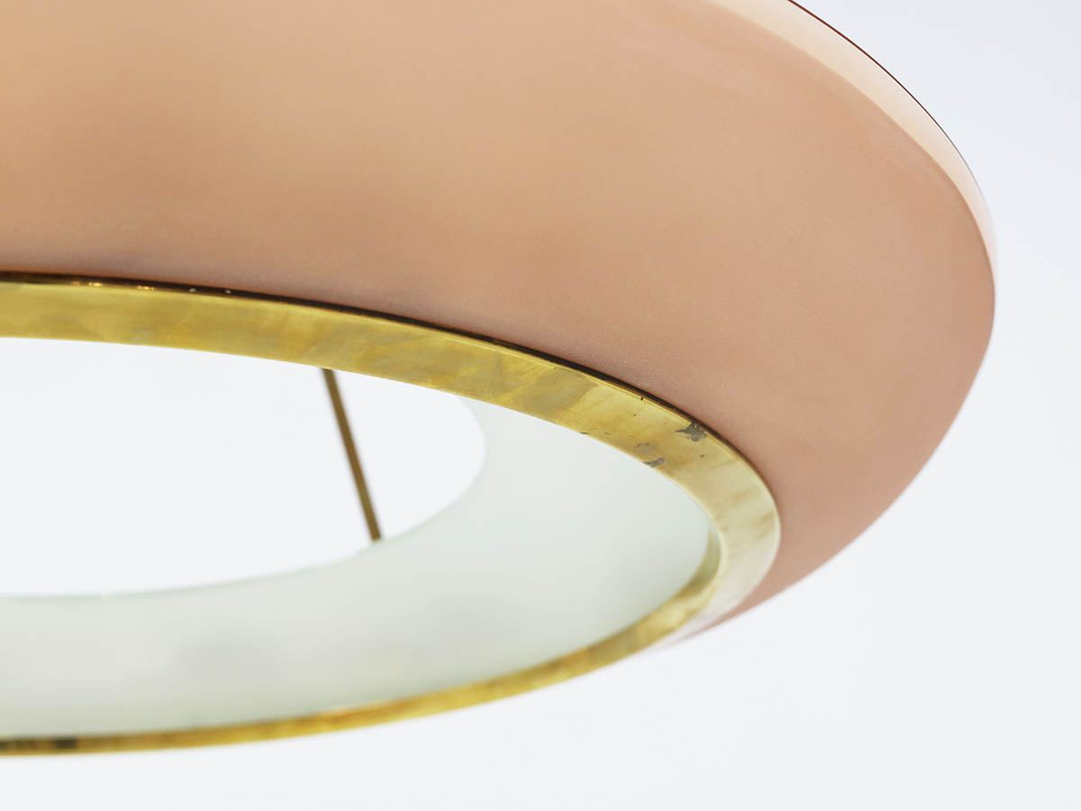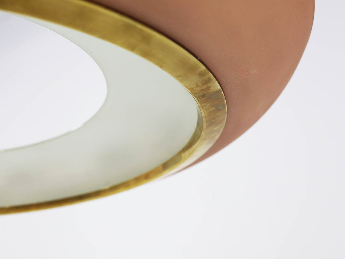 Among his most notable creations is the large chandelier model 1881, an outstanding example of Max Ingrand’s design vision. Crafted in curved pink glass, this chandelier combines visual lightness with a strong sculptural presence, diffusing a warm and sophisticated glow. This model is extremely rare, and in this significant 90 cm size it represents a unique piece, making it highly valuable for collectors and high-end interior design projects. The refined glass craftsmanship—hallmark of Fontana Arte—enhances the material and chromatic qualities of the design, making it ideal for prestigious residential and contract environments.