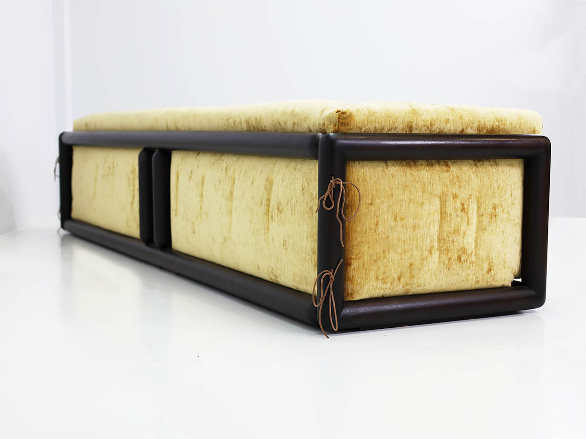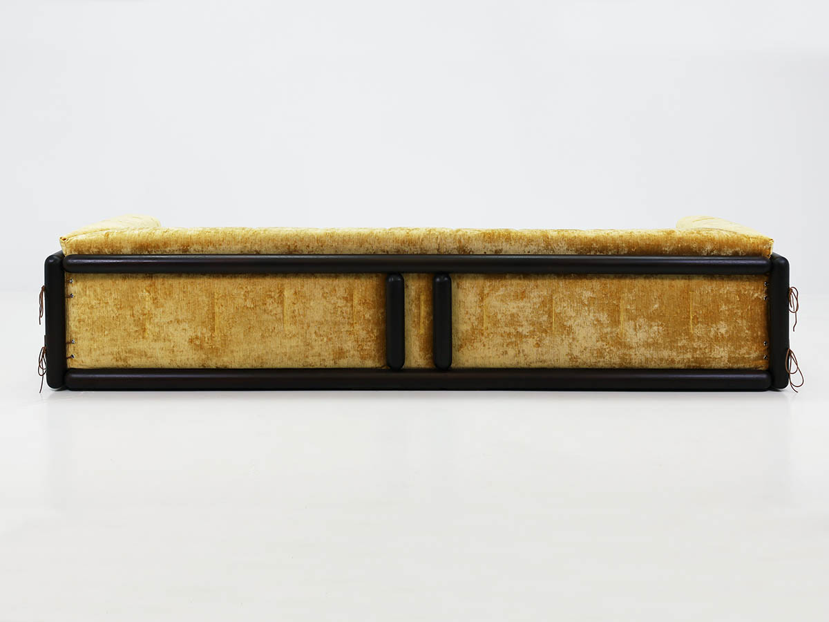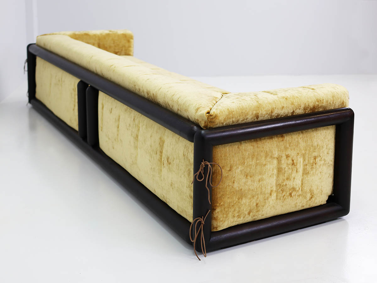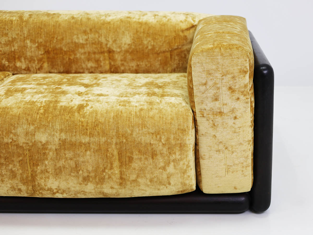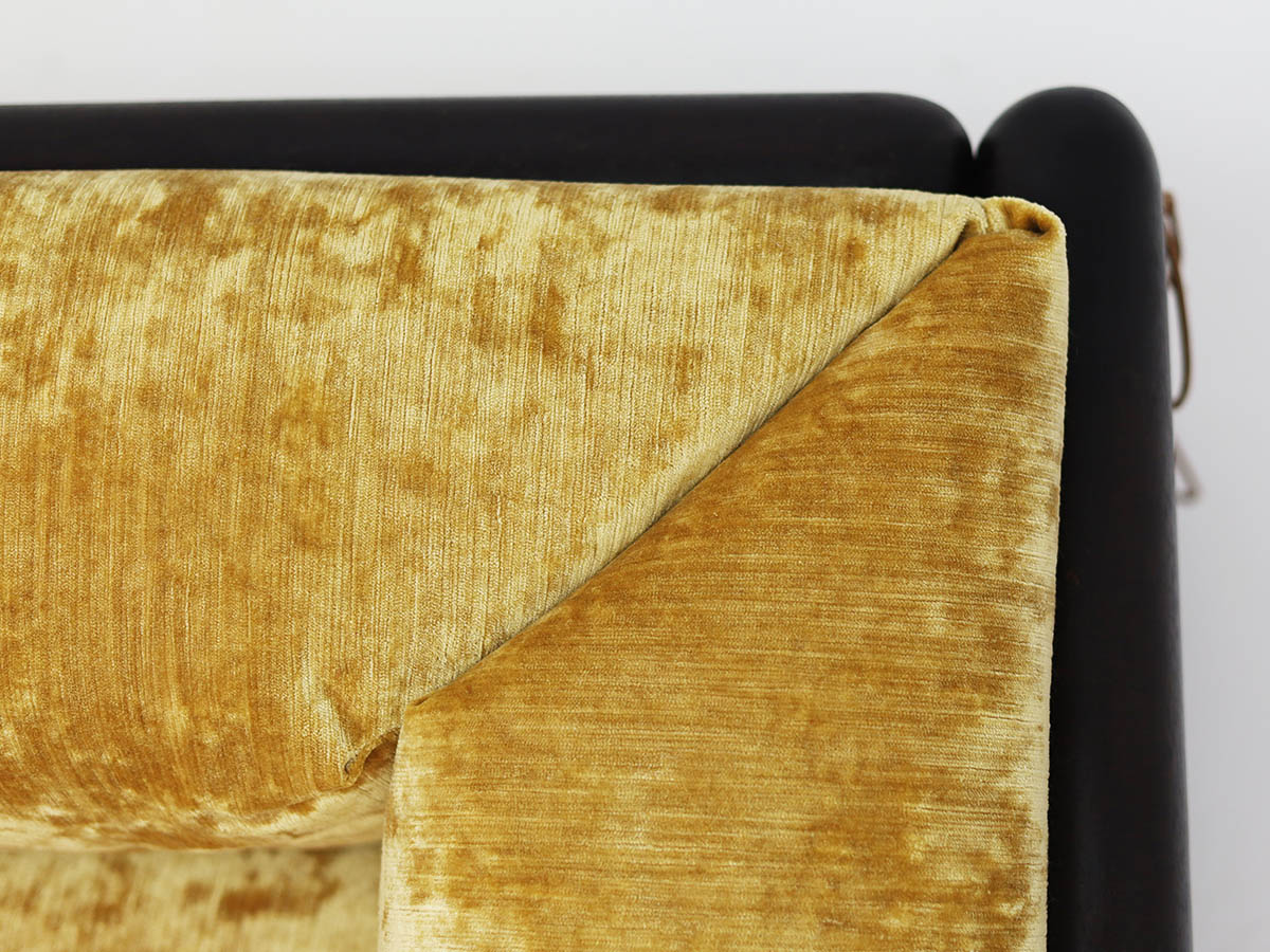 Throughout his career, Scarpa collaborated with major figures in the design industry, including Dino Gavina and Simon, producing iconic pieces that balance technical innovation with refined aesthetics. Among these, the Cornaro sofa, produced in 1969, in its large three-seater version, upholstered in the iconic and original Simon gold velvet, exemplifies Scarpa’s mastery of harmonizing materials, form, and function.